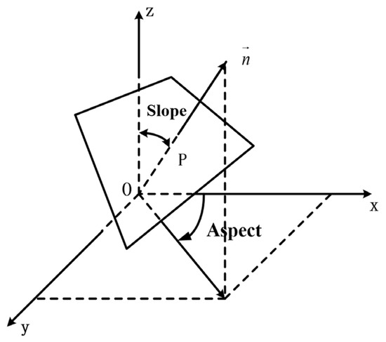 denotes the normal vector of the horizontal plane. The slope direction is calculated using the following formula: