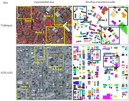 Figure 9. Additionally, three smaller areas, labeled Area 1, Area 2, and Area 3, were selected from each dataset’s experimental area. These regions, marked by wireframes in the roof extraction results shown in