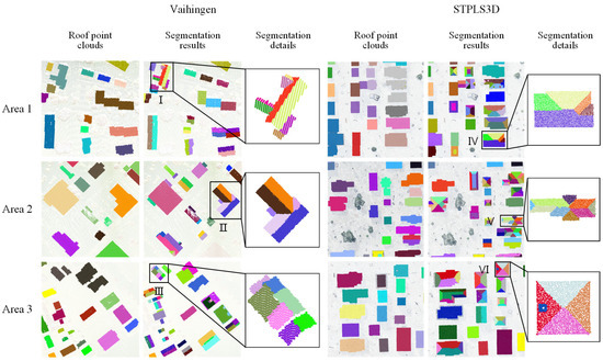 Figure 10, are generally good. Various roof types are segmented accurately, including complex combined roofs. In Area 1, the roof types are primarily flat and sloped roofs, and the overall segmentation accuracy is better with precise boundary delineation for each plane. The roof types in Area 2 typically consist of fewer planes. The segmented surfaces are clear and complete, with strong differentiation between individual planes. Area 3 contains more complex and diverse roof types. Some edge point clouds were misclassified, resulting in slightly lower segmentation performance than in Areas 1 and 2. The three areas of complex roofs (I, II, III) in