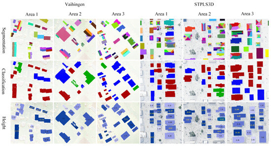 The difference between the manual measurements and the calculated results from this paper is recorded as an error. The building height error for the three areas in the Vaihingen and STPLS3D regions is shown in