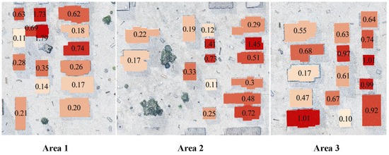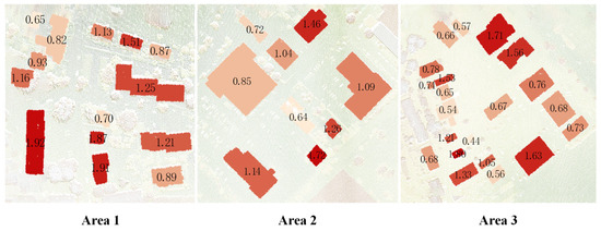 Figure 10, rounded to two decimal places in meters. Yellow numbers indicate buildings taller than 9 m, while black numbers indicate buildings shorter than 9 m. The blue roof color gradient, ranging from light to dark, represents the gradual increase in building height from low to high. The results highlight representative areas.