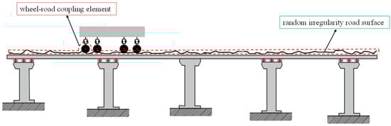 23] is introduced to simulate the interaction between wheel and road nodes, thereby enabling precise computation of dynamic responses across the vehicle–bridge system. This element comprises a wheel node and all potential road nodes that the wheel may traverse, thereby maintaining the finite element model of the vehicle–bridge system unchanged during the vehicle’s movement. This approach enhances the efficiency of numerical simulations for vehicle–road interactions. The study further examines the effects of random road irregularities on the dynamic responses of both the vehicle and the bridge. These irregularities are incorporated as input parameters for the wheel–road coupling element, simplifying the simulation of random road irregularities by avoiding eliminating the necessity for wheel–road interaction constraint equations.