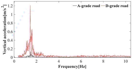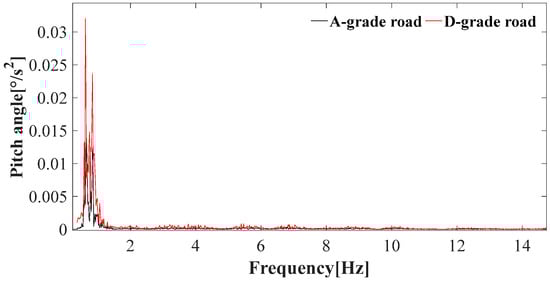 Figure 17 shows that the amplitudes for both A-grade and D-grade roads are mainly concentrated in the frequency range of 0~2 Hz, with the amplitude on D-grade roads being nearly eight times that on the A-grade roads. Overall, as road roughness deteriorates, the main distribution frequency range of the vehicle body’s acceleration response remains largely unchanged, but the corresponding amplitude increases significantly.