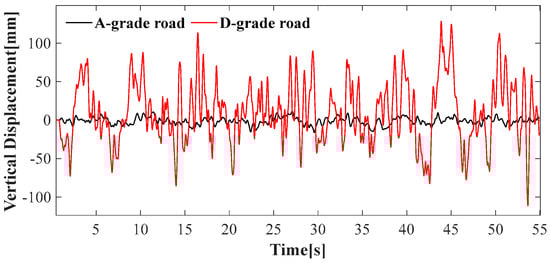 Figure 9, the vertical displacement of the trailer on an A-grade road surface ranges from −14.1984 mm to −8.467 mm. In contrast, on a D-grade road surface, the range significantly extends from −106.044 mm to 119.557 mm, with the amplitude on the D-grade road being 9.95 times that of the A-grade road.