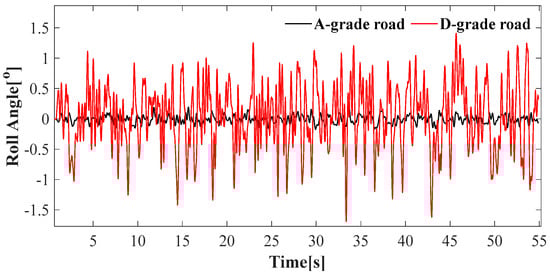 Figure 19 indicates that the roll angle range of the tractor on A-grade and D-grade road surfaces is −0.163° to −0.161° and −1.661° to 1.358°, respectively. According to