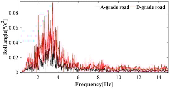2. On D-grade roads, the roll angle is primarily distributed within the 0.364 Hz to 1.894 Hz and 2.386 Hz to 4.608 Hz frequency ranges, with corresponding maximum amplitudes of 0.088°/s