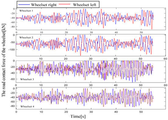 Figure 27. From top to bottom, the subplots represent the contact forces for wheelsets 1 through 4. Each subplot includes the contact forces of the left and right wheels, with the right wheel’s contact force shown in blue and the left wheel’s contact force in red. The amplitude and frequency of contact force fluctuations vary among different wheelsets. The detailed analysis for every wheelset is as follows: