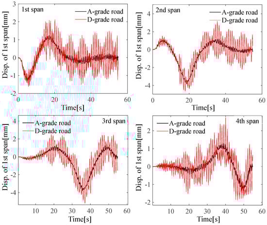 Figure 29. In the figure, the dynamic response for A-grade road conditions is represented by black lines, and for D-grade road conditions by red lines. It may need to be mentioned that the time periods during which the vehicle traverses first to fourth spans are 1.477 to 9.778 s, 8.821 to 27.839 s, 26.879 to 45.900 s, and 44.940 to 54.719 s, respectively. Based on the displacement responses of the four mid-span points of the bridge as the vehicle traverses it, shown in the figure, the fluctuation patterns and amplitudes in each subplot can be analyzed as follows: