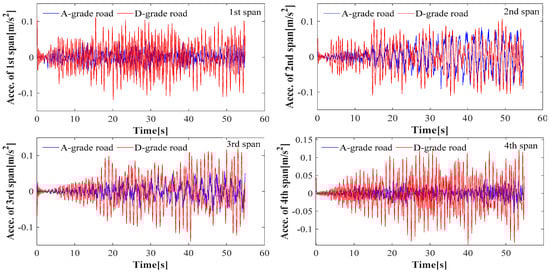 2. The amplitude for D-grade conditions is 2.28 times that of A-grade conditions. For the fourth span, the acceleration amplitude under A-grade conditions ranges from −0.0551 to 0.04729 m/s