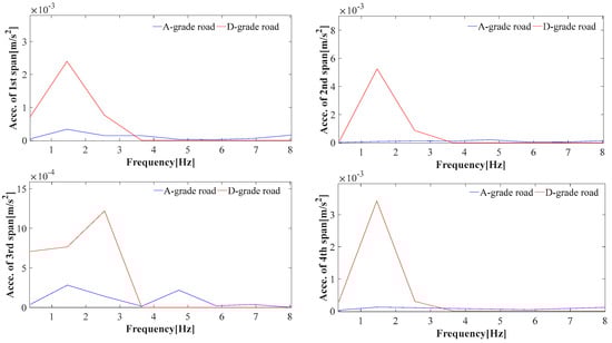 −4. These comparisons reveal that the level of road irregularity affects not only the amplitude of bridge vibrations but also the dominant frequency characteristics of the vibrations. Comparing the displacement and acceleration responses at the mid-span points of the bridge under A-grade and D-grade road conditions, it can be observed that the road surface grade significantly impacts the dynamic responses of both heavy trucks and bridge structures.
