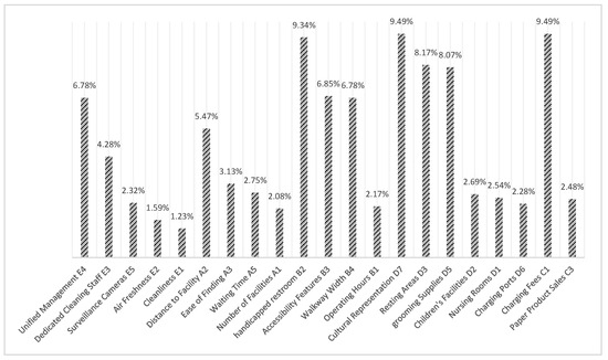 - Indicators related to humanistic aspects have generally higher weights. For example, “charging fees” (C1), “cultural representation” (D7), and “handicapped restroom” (B2) all have weights above 9%. This indicates that there is a high level of public attention to humanistic-related facilities in public toilets. Whether a public toilet charges a fee significantly affects people’s willingness to use it. As a representation of the city’s image, public toilets also need to embody the city’s cultural functions. The high weight of the handicapped restroom indicator highlights the focus on care for disabled individuals, a key aspect of urban design.