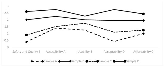 - Acceptability Indicators: There is a relatively large difference in scores among the four samples, indicating significant disparities in the levels of investment in humanistic care-related facilities among the samples.