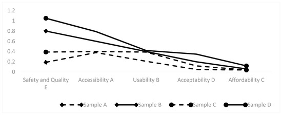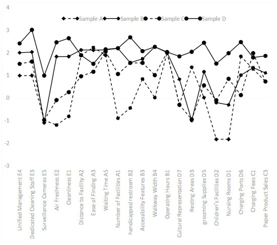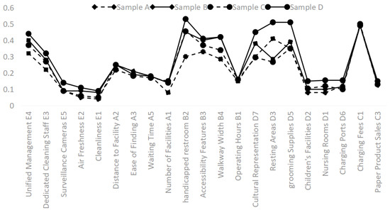 - Safety and Quality Indicators: There is a significant difference between the samples, indicating a substantial disparity in the basic environmental conditions of different public toilets. In the indicator layer, Sample A shows a notable difference in basic environmental indicators compared to public satisfaction expectations and the other three samples. All four samples scored high on “unified management” (E4), which, according to expert interviews, is because the vast majority of public toilets are uniformly managed by relevant government departments.