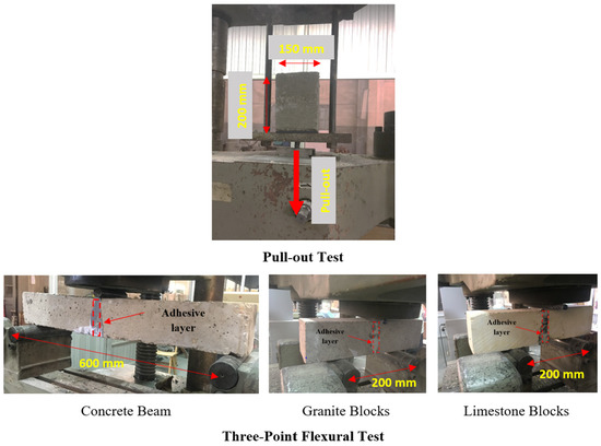 Granite and limestone blocks (typically found in historic buildings) with a width of 100 mm, a height of 100 mm and a length of 200 mm were used. For each stone type, two blocks were bonded face-to-face using the developed GPs. The bonded specimens were subjected to a three-point flexural test after 28 days of curing, following the same procedures used for the repaired concrete beams. Details of the specimens and test setup are shown in Figure 1.