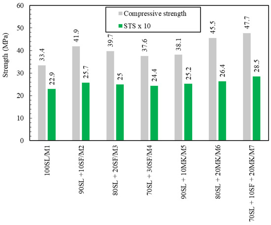 Compressive strength and STS of all developed GP mixes.