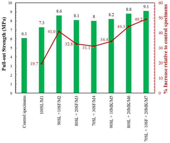 Figure 3 and Table 3 exhibit the average pull-out strength of all tested specimens. It can be observed that the pull-out strength of the control specimens (those with a steel bar embedded during casting) was 6.1 MPa. Using the GP mixes developed in this study as an adhesive agent at the concrete–steel interface obviously increased the load required to pull out the steel bar from the concrete substrates. Among the investigated GPs, the mix produced with only SL (M1) showed the lowest pull-out strength with a value of 7.3 MPa, which is 19.7% higher than that of the control specimens. Replacing SL with SF yielded higher strengths, showing the maximum value at a replacement level of 10%. The mix with 90% SL and 10% SF (M2) exhibited a pull-out strength of 8.6 MPa, which is 41% higher than that of the control specimens. Increasing the addition of SF by higher than 10% showed less improvements. The improved bonding resulting from the use of SF was also confirmed by Songpiriyakij et al. [9], who studied the incorporation of SF into FA-based GP. The pull-out strength of mixes M3 and M4 (with 20% and 30% SF, respectively) were 8.1 and 8.0 MPa, respectively, which was about 32.8% to 31.1% higher than that of the control specimens. For the mixes with 10% and 20% of MK (M5-M6), the pull-out strength was 8.2 MPa and 8.8 MPa, respectively, which were 34.4% and 44.3%, respectively, higher than those of the control specimens. The highest pull-out strength was achieved with the mix containing 70% SL, 20% MK, and 10% SF, reaching 9.1 MPa, which was 49.2% higher than the control specimens. The improvements observed with the addition of SF and/or MK can be attributed to the same factors that contributed to enhancing the compressive strength and STS.