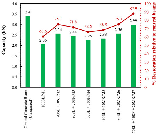 Figure 4 and Table 3 show the ultimate loads sustained by all unrepaired and repaired concrete beams. The control beams (unrepaired) sustained an average ultimate load of 3.40 kN. Using the SL mix (M1) for repairing beams, retrieved around 60.6% of the original capacity of the control beams, in which the beams repaired with SL mix exhibited an ultimate capacity of 2.06 kN. Better performance was observed when SF and/or MK were combined with SL. Beams repaired with mixes containing SL and SF (M2–M4) failed after reaching ultimate capacities in a range of 2.25~2.56 kN, which represented around 66.2~75.3% of the flexural capacity of control beams. Consistent with previous results, the M2, M3, and M4 mixes showed that a 10% SF replacement level achieved the maximum capacity restoration. Similar improved results were observed when GP mixes with SL and MK were used for repair. The ultimate capacities achieved were 68.5% and 75.3% of the control beams’ capacity with M5 (90% SL + 10% MK) and M6 (80% SL + 20% MK), respectively. The greatest capacity restoration was reached with the GP mix composed of 70% SL, 20% MK, and 10% SF, which resulted in an ultimate capacity of 2.99 kN—87.9% of the ultimate capacity of the control beams.
