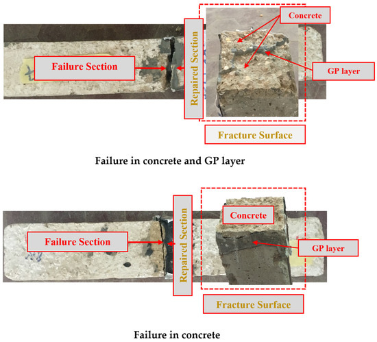 Table 3 displays the failure modes for all repaired beams, while Figure 5 depicts the typical failure mode observed among the tested beams. As can be seen, the failure surface either developed solely within the concrete or passed through both the concrete and the GP layer, but without signs of complete debonding. This indicates strong adhesion between the GP layer and the concrete. Although in some beams, failure occurred in the concrete slightly away from the repaired section, they did not fully restore the capacity of the control beams. This could be attributed to the fact that, prior to repair, the beams were pre-loaded up to failure, which most likely developed micro-cracks at the concrete beam itself, especially around the fracture zone, which may lead to early failure in the second loading cycle after repair.