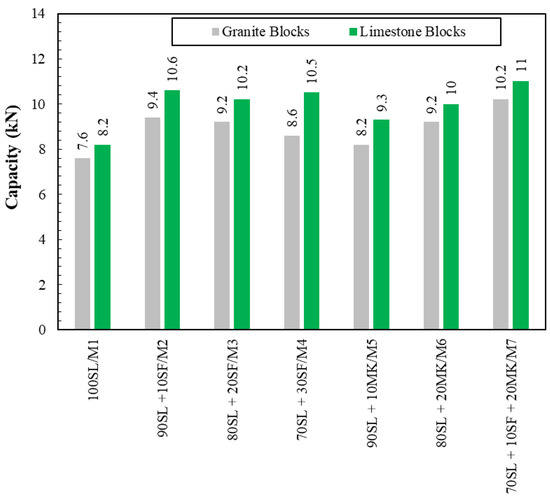 Figure 6 and Table 3 present the ultimate capacity of all tested granite and limestone blocks bonded by GP layers. With the SL mix (M1), the granite and limestone specimens could carry a load of up to 7.6 kN and 8.2 kN, respectively. When SF was blended with SL, a stronger bond between the blocks was achieved. For mixes with SL replaced by 10%, 20%, and 30% SF (M2-M4), the ultimate load carried by the bonded granite specimens increased by 23.7%, 21.1%, and 13.2%, respectively, compared to those bonded with the SL mix (M1). These increases reached up to 29.3%, 24.4%, and 28%, respectively, in the limestone specimens. Replacing SL with MK also enhanced the adhesion of GP to granite and limestone blocks. At replacement levels of 10% and 20% MK (M5–M6), the bonded granite specimens sustained an ultimate load of 7.9% and 21.1% higher than those sustained by specimens bonded with SL mix (M1). The improvements in the limestone specimens were 13.4% and 22% when M5 (90% SL + 10% MK) and M6 (80% SL + 20% MK), respectively, were used. The highest capacity was achieved in both granite and limestone specimens when the GP mix consisting of 70% SL + 20% MK + 10% SF was used, achieving a capacity of approximately 34% (in both block types) higher than those bonded with the SL mix (M1). The results also indicated that for the same GP mix, the bonded limestone specimens carried a relatively higher load than that carried by the bonded granite specimens. This could be attributed to the porous surface of the limestone, which may have helped to form a higher bonding with the GP layer, compared to the granite blocks that had a smoother surface with low porosity.