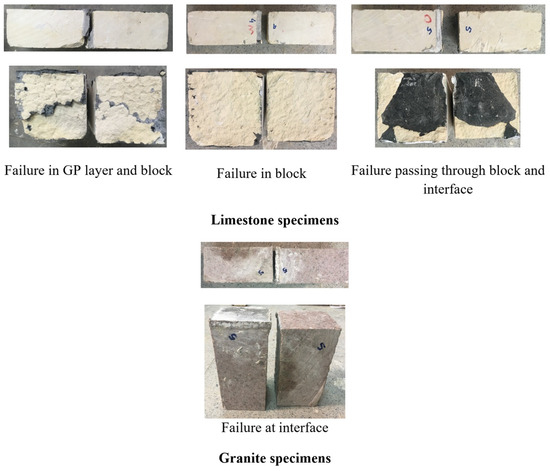 By investigating the failure pattern, it was observed that in the granite specimens, the failure typically occurred at the interface (see Table 3 and Figure 7), which was the weakest zone relative to the high strength of both the granite and the GP layer. On the other hand, since the bonding between the limestone and GP layer was stronger, failure was not governed by interface debonding. Instead, different failure modes were observed, including failure in both the GP layer and the block, failure within the block, and failure that passed through both the block and the interface, as shown in Figure 7. The failure types experienced by each specimen are presented in Table 3.