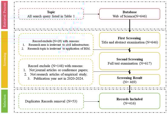 - Stage 1: The first screening aimed to ensure relevance. Only articles focused on BIM and explicitly addressing its applications in engineering were retained. In this initial screening, 29 articles were deemed irrelevant and discarded, leaving 617 articles for the second screening.