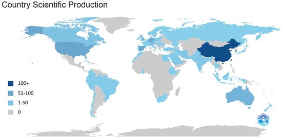 - Dark blue represents countries with a scientific output of 100 or more publications, primarily concentrated in China, indicating a significant research output in this field;