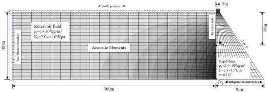 Most of the previous studies ignored the dynamic water pressure and the effect of water dissipation, or simplified them to consider the role of water gravity in studying the seismic response of structures across a river. However, for tunnels, basements, buried pipelines, and other underground structures, the effect of seismic actions will lead to fluctuations in the dynamic pressure of the water, which will cause structural vibration, resonance, deformation, damage, leakage, and corrosion, and the role of water dissipation should not be ignored [,,,]. On the basis of the validation of the relationship between acoustic–solid coupling and Westergaard’s theoretical solution, the river water is considered as an acoustic medium for the simulation of the coupled fluid–solid interaction in this paper. The water density is 1000 kg/m3 and the bulk modulus is 2.04 GPa.