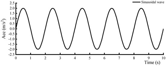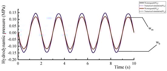This study focuses on fluid–structure coupling interactions, treating acoustic elements as fluids to simulate the interactions between water and the structure. Based on the validation model by Fu et al. [], a two-dimensional coupling model of the water and dam is established. The geometric parameters and material properties of the model are outlined in Figure 1, with a horizontal sinusoidal wave excitation applied at the base of the dam, as illustrated in Figure 2. Constraints and acoustic impedance conditions are established for the free water surface, the water cutoff section, and the contact surface between the reservoir water and the dam. A comparative validation of the numerical simulation results against the Westergaard theoretical solution is conducted. Figure 3 displays the maximum hydrodynamic pressure distributed along the dam face. Figure 4 presents a comparison of the hydrodynamic pressure time history at the monitoring points Wb and Wm with the Westergaard analytical solution, which confirms the accuracy of the acoustic element in simulating water–structure dynamic interactions, though it is still important to note that numerical models are usually subject to some degree of uncertainty [,].