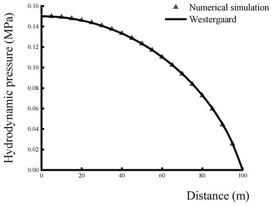 - By comparing with Westergaard’s analytical solution, it is verified that the coupled flow–solid interaction simulation using the acoustic module in ABAQUS can accurately calculate the hydrodynamic pressure in the watershed.