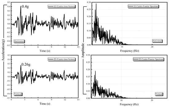 The 1940 El Centro earthquake record, a benchmark in numerical seismic analysis, provides a valuable dataset for validating and comparing structural responses to strong ground motions. This record is widely used in the numerical analysis of underground structures. To simplify seismic analysis, one needs to capture key structural response and dynamic features, and simulate the effects of near-field earthquakes while potentially minimizing computational costs; the first 15 s of the north–south seismic waves of the 1940 El Centro earthquake were used in this study. The acceleration time history curve of the seismic motion is depicted in Figure 7. Referring to the ground vibration input method introduced by Huang [,], seismic waves are vertically inputted on the bottom of the soil body as equivalent nodal forces. For irregular subsurface structures, it is desirable to calculate both transverse and vertical horizontal seismic effects []; therefore, the effects of transverse (horizontal) and combined transverse and vertical seismic motions are discussed in this paper.