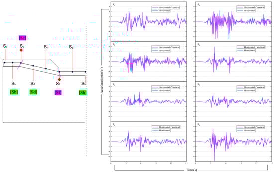 Previous global seismic damage has shown that site effects have severe impacts on structures []. For structures crossing a river, the seismic amplification effect caused by the topography of the river basin cannot be ignored. To investigate this site effect and hydrodynamic pressure fluctuations due to seismic action on the lower utility tunnels, eight monitoring points (Sa, Sb, Sc, Sd, Se, Sf, Sg, Sh) are arranged along the mid-section at the top of the utility tunnel in soil, as seen in (Figure 8).