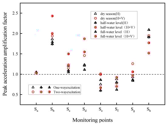 Figure 9 shows the peak acceleration amplification coefficients at each monitoring point under different seismic excitation directions and water level changes in the river channel. The acceleration response near the river channel is affected by the more obvious water level changes, and the peak acceleration amplification coefficients at the junction location of the river bank and the river bed, point Sf, under unidirectional seismic effects are 0.88, 0.8, and 0.62 under the conditions of no-water, half-water, and full-water, respectively, indicating that there is a decreasing trend of acceleration amplification coefficient at this point with the rise of the water level, and point Sh at the center shows the opposite. The maximum peak acceleration amplification coefficients at points Sg and Sh under bidirectional seismic excitation occur under the no-water condition, and the peak acceleration values at the monitoring points at the riverbank location are larger than those under the no-water condition at the half-water and full-water conditions.