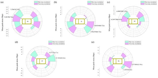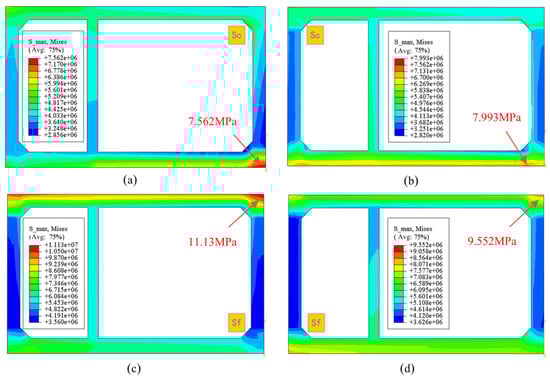 Figure 10 illustrates the peak Mises stress at the vertices a, b, c, and d sections. It is evident that the peak Mises stress under bidirectional earthquake excitation (Figure 10a–c,e) is greater than that under unidirectional input, particularly in the middle of the horizontal riverbed section of the utility tunnel. Notably, regardless of whether the excitation is unidirectional or bidirectional, it can be observed that at section Sc, located at the junction of the horizontal riverbank section and the sinking section, the Mises peak stress at the bottom points c and d is significantly greater than at the top reference points a and b, all over 50%. Conversely, at the Sf section, which encompasses the sinking section and the horizontal riverbed section, this trend is reversed. This indicates that under the influence of seismic forces, the utility tunnel experiences greater forces at the bottom where the horizontal riverbank section transitions to the sinking section. In contrast, at the junction between the sinking section and the horizontal riverbed section, the UT bears the greater forces. To further analysis stress characteristic in the UT, Figure 11 shows the Mises stress cloud at the Sc and Sf sections as a more intuitive observation of the stress distribution at the junctions under seismic loading.