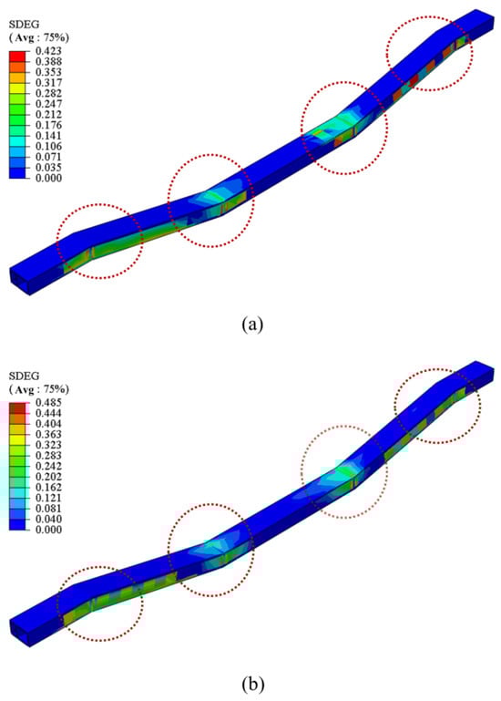 Plastic damage distribution cloud map, (15 s). (a) One seismic excitation, (b) two seismic excitations.