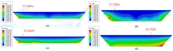 To investigate the characteristics of hydrodynamic pressure responses under varying seismic excitation directions and water level changes, a comparative analysis of hydrodynamic pressure was conducted. Figure 13 illustrates the hydrodynamic pressure distribution across the river cross-section at maximum pressure locations for different water levels and seismic excitations. With the hydrodynamic pressure distribution at the full-water level as an example, the hydrodynamic pressure distributions under unidirectional and bidirectional seismic wave excitations are shown in Figure 13b and Figure 13d, respectively. Under unidirectional seismic excitation, the maximum hydrodynamic pressure tends to concentrate on both riverbanks, increasing from the water surface to the riverbed and gradually decreasing towards the middle of the riverbed, with the maximum pressure on the left bank recorded at 21.72 kPa. Notably, under bidirectional seismic excitation, the distribution of hydrodynamic pressure in the river expands compared to unidirectional excitation. It gradually decreases from the free water surface to the riverbed, with the maximum hydrodynamic pressure concentrated at the bottom of the right bank, recorded at 36.77 MPa. The unidirectional seismic input, oriented transversely across the river, primarily induces a transverse seismic response in the model. This results in significant oscillation of the water body in the transverse direction, concentrating maximum hydrodynamic pressure on both riverbanks. Conversely, bidirectional seismic excitation introduces vertical effects by simulating the concurrent action of seismic P-waves and shear waves. This dual-direction influence increases the vertical oscillation forces on the water body, leading to a wider distribution of hydrodynamic pressure and a noticeable increase in the maximum hydrodynamic pressure.