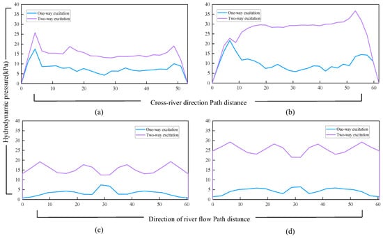 Hydrodynamic pressure on the reference path. (a,b) Reference path across the river’s direction; (c,d) reference path in the direction of the river.