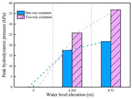 Figure 15 shows the maximum hydrodynamic pressure with water volume changes. From Figure 13 and Figure 14, it is evident that high water levels significantly elevate the maximum values of hydrodynamic pressure. It is important to note that the change in water level is not proportional to the change in the water storage per unit length of the channels. In this study, the model sets the half-channel water level at 4.365 m, corresponding to a water storage of 212.9 m3 per unit length of the channel, and the full-channel water level at 8.73 m, with a water storage of 463.9 m3 per unit length of the channel. Different seismic excitation directions will have an impact on the distribution and peak values of the maximum hydrodynamic pressure in the river (Figure 13, Figure 14 and Figure 15). At the half-channel water level, the maximum hydrodynamic pressure in bidirectional seismic excitation is 47% higher than that in unidirectional seismic excitation. At the full-channel water level, the maximum hydrodynamic pressure under bidirectional seismic excitation is 69% higher than under unidirectional seismic excitation. In the same intensity unidirectional seismic excitation, the maximum hydrodynamic pressure at the full-channel water level is 24% higher than at the half-channel water level. Similarly, under the same bidirectional seismic excitation, the maximum hydrodynamic pressure at the full-channel water level is 42% higher than at the half-channel water level.