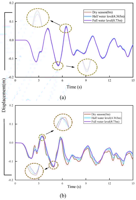Under seismic forces, the water in the river produces not only hydrodynamic pressure, but a certain energy dissipation and seismic reduction effect. Table 6, below, presents the peak values of combined displacement (U), Mises stress, compressive stress (DAMAGEC), tensile stress (DAMAGET), overall stress plastic (SDEG), and acceleration (ACC) under bidirectional seismic excitation for three water level conditions. To investigate the effect of river level on the displacement response characteristics of the UT, the displacement time history curves of the UT in the transverse and vertical seismic excitation directions are illustrates in Figure 16.