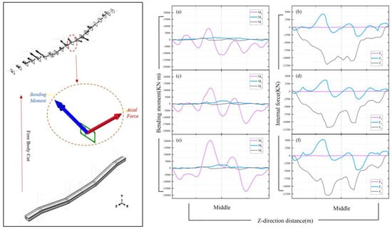 Bending moment and internal force distribution curve of the utility tunnel. (a,c,e) Bending moment, (b,d,f) Internal force.
