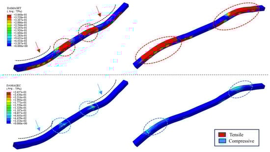 To identify the seismic damage locations in the utility tunnel, Figure 18 illustrates the tensile and compressive damage distribution cloud maps of the UT. The deformation coefficients of these damage distribution cloud maps were scaled up proportionality in order to show the deformation trend of the utility tunnels more clearly.