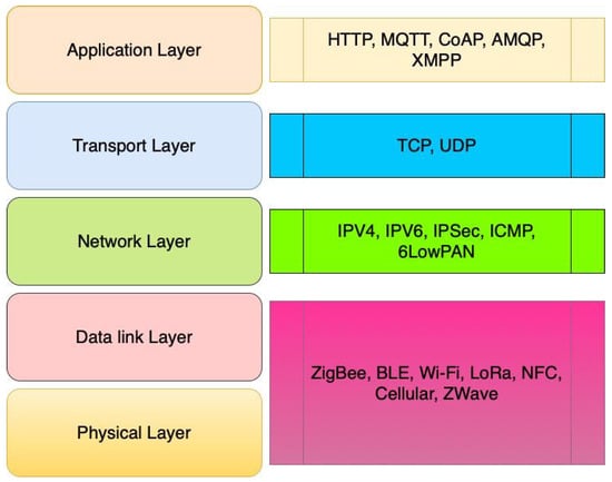 The sensing layer manages IoT sensors and actuators, also known as the physical layer. Sensors keep track of a wide range of physical processes in their immediate surroundings. Actuators use sensory data to accomplish a specified task in a physical situation. At the physical layer, the following critical security threats can be encountered: (1) Denial of Service (DoS): A well-known type of security attack can keep IoT devices busy receiving and processing erroneous signals, preventing them from converting to an energy-saving sleep mode and quickly draining their battery capacity. Denial-of-sleep is another name for this form of DoS attack, and it is seen as a particularly critical security issue for IoT devices with little battery capacity. (2) Selective Jamming Attack: Jamming attacks are among the most severe and well-known DoS attacks against wireless networks. Selective jamming is more power-efficient to run and substantially more challenging to check and recognize than other jamming attacks due to the opponent’s lesser exposure. (3) Insecure Initialization: Initializing and configuring IoT at the physical layer is a precautionary measure that ensures appropriate use of the entire framework while ignoring security and network service interruption. The attacker injects malicious code into the memory of the IoT devices as part of the attack. (4) Insecure Physical Interface: A few physical components work together to create real threats to IoT device functionality. Physical security flaws, programming access through physical interfaces, and testing/debugging devices have all been used to compromise network nodes. (5) Spoofing: These attacks target the weaknesses in IoT device identity validation methods. Rich countermeasures are challenging to build due to resource restrictions and the enormous number of IoT devices. The Sybil assault is a paradigm in which adversaries attempt to duplicate or counterfeit real people’s identities to commit malicious behaviors and degrade IoT performance [