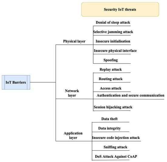 Figure 10 illustrates a comprehensive categorization of IoT security issues. In the IoT layered architecture, security threats are separated into three categories: threats at the physical layer, threats at the network layer, and threats at the application layer. It is mandatory to note that the security threats related to IoT at various levels outlined below are not all-inclusive [