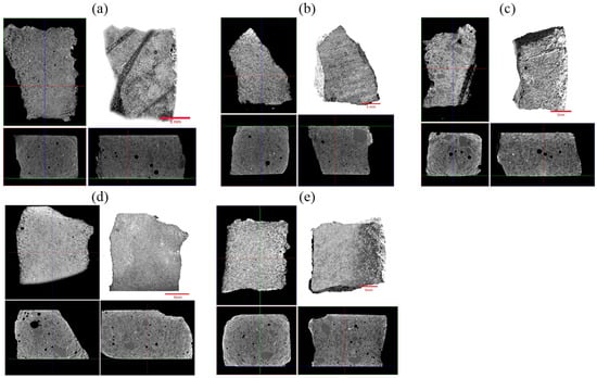 Table 3 presents the calibration of the density range used in the CTan software to analyze X-ray μCT images. In Table 3, the minimum value of HU corresponds to the darkest shade of gray in the considered scale (black), equivalent to the density of carbonated ettringite (1.76 g/cm3). The maximum value of HU corresponds to the lightest shade of gray in the scale (white), equivalent to the density of the corundum (3.99 g/cm3), a mineral based on aluminum oxide, which represents a value of 9 in the Mohs hardness scale [38,39]. Thus, in the X-ray μCT images, the black color represents elements of lower density, such as pores, while the white color stands for higher-density elements, such as metals.