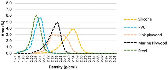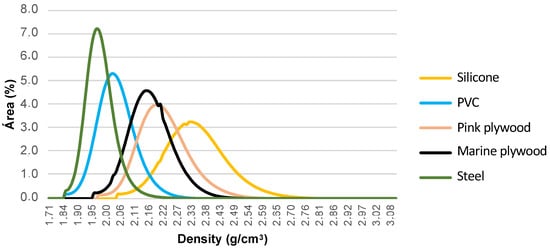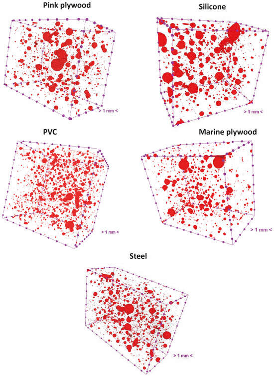 Galvanized steel and regular plywood (pink) had similar results, leading to intermediate density values with similar pore volumes, sizes, and distribution. Silicone and marine plywood were responsible for the lowest surface densities, with similar pore volumes. However, silicone led to larger surface pores than marine plywood in µCT, although it concentrated almost 25% in smaller sizes around 4.0 µm.