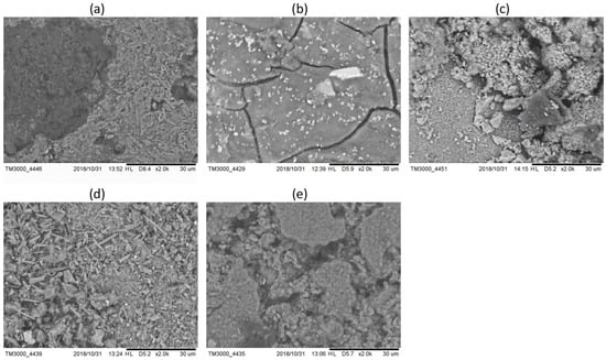 Figure 6 shows the SEM images of the concrete surfaces cast within the different formwork materials at 2000 times magnification, illustrating distinct microscopic morphological formations. SEM images had shades from white to black with several gray tones. According to Monteiro et al. [44], anhydrous cement grains should have the lightest coloration, as should calcium hydroxide (Ca(OH)2), which should present a light gray tone; a dark gray tone is expected from C-S-H and voids are black. Especially in Figure 6a,c,e, C-S-H may be verified as an amorphous, fibrous structure in the darker gray regions, while voids appear as black areas scattered throughout the image. Figure 6b potentially displays light gray crystals typical of Ca(OH)2 with dark cracks representing voids.