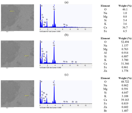 Concerning EDS, evaluated in association with SEM, Figure 9 depicts the results of the concrete surface cast within galvanized steel formwork. Firstly, Figure 9a refers to the darkest shade observed in the specimen, indicating the probable presence of tetracalcium aluminoferrate (C4FH). The C4FH phase is a solid solution oscillating between C2F and C6A2F [45]. The spectrum in Figure 9b highlights the presence of zinc (Zn). Since the steel used as formwork receives a thin layer of Zn for galvanization to protect it against corrosion, the Zn may have reacted with the other cement products. Lastly, Figure 9c shows, as well as Zn, the occurrence of bromine (Br). Br may be present in drinking water, as it is an agent similar to chlorine (Cl) in the water disinfection process [46]. However, Br is an aggressive agent for steel corrosion, in addition to it potentially causing the decomposition of C-S-H and other harmful reactions [47].