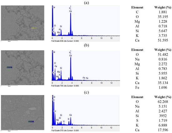 Energy Dispersive X-ray Spectroscopy (EDS) spectrum of the concrete surface cast within PVC: (a) Rounded crystals; (b) Less rough region; (c) Darker crystals.
