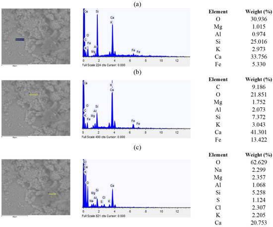 Figure 10b depicts a spectrum formed on the less rough region of the concrete surface molded with marine plywood, possibly containing tricalcium silicate or alite (C3S) due to the observed amounts of O, Ca, and silicon (Si). In the case of C3S silicates, small amounts of ions (magnesium (Mg), aluminum (Al), iron (Fe), potassium (K), sodium (Na), and sulfur (S)) occur [52]. Mg contents above 2% can crystallize as periclase, which has slow hydration and can increase in volume over the years, causing internal tensions. On the other hand, Mg ions may react with the cement mortar, forming a magnesium hydroxide film over the substrate, preventing sulfate ions from entering [53]. The occurrence of alkalis, K and Na, can affect the cement’s setting time, accelerating it and impacting mechanical strength development [54].