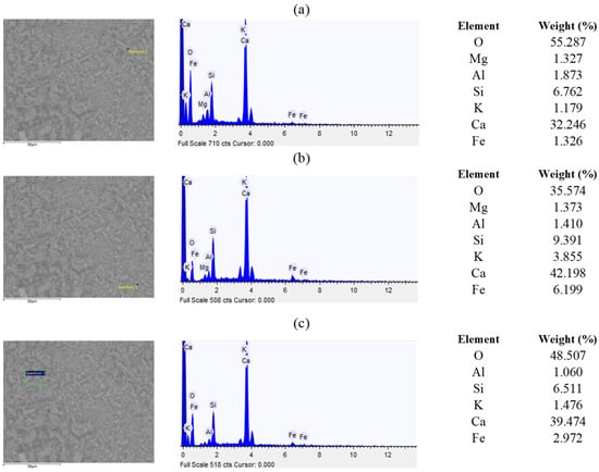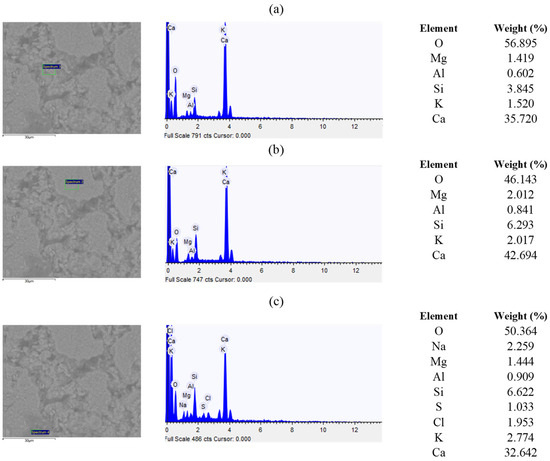 EDS analysis of the concrete produced with silicone formwork is presented in Figure 12. In this case, the chemical compositions along the three spectra of the specimens remained similar, with no particular occurrences within the subfigures (Figure 12a–c), which have all shown mainly O, Ca, and Si with the highest amounts. Unlike other formwork materials, silicone can have a lower chemical reactivity [58], and, probably because of that, the resulting concrete surfaces showed fewer impurities or migrations.