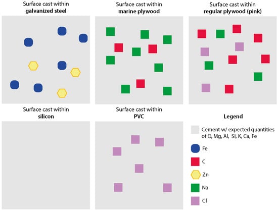 Five different formwork materials were used for casting the concrete, aiming to evaluate the impacts on its surface. The selected materials were galvanized steel, regular plywood (pink), marine plywood, polyvinyl chloride (PVC), and silicone. Although both the regular and the marine plywood are composites produced by gluing together sheets of wood, solely the marine plywood is externally coated with a phenolic resin, which enhances its resistance to water and facilitates the removal of the casting. One of the advantages of using plywood is its availability in several thicknesses and lengths, with it being extensively used in construction [28]. Table 2 shows the elementary chemical composition of the casting materials and extra additives or finishing, following the existing literature.